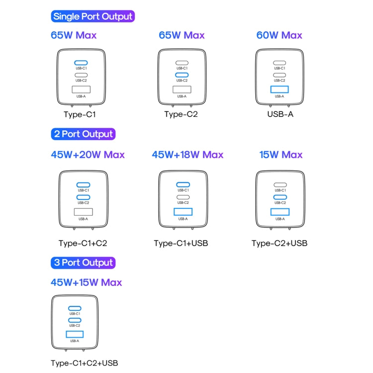 7. USB-C1+C2+USB-A Output: 45W+15W (max)